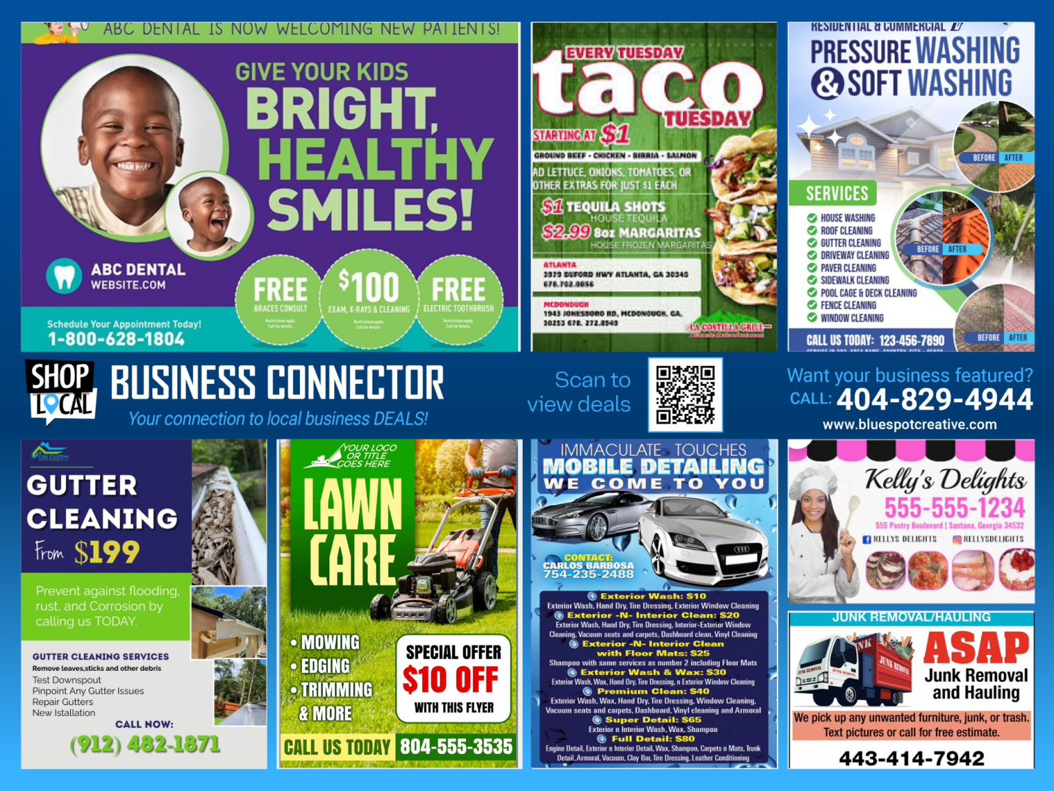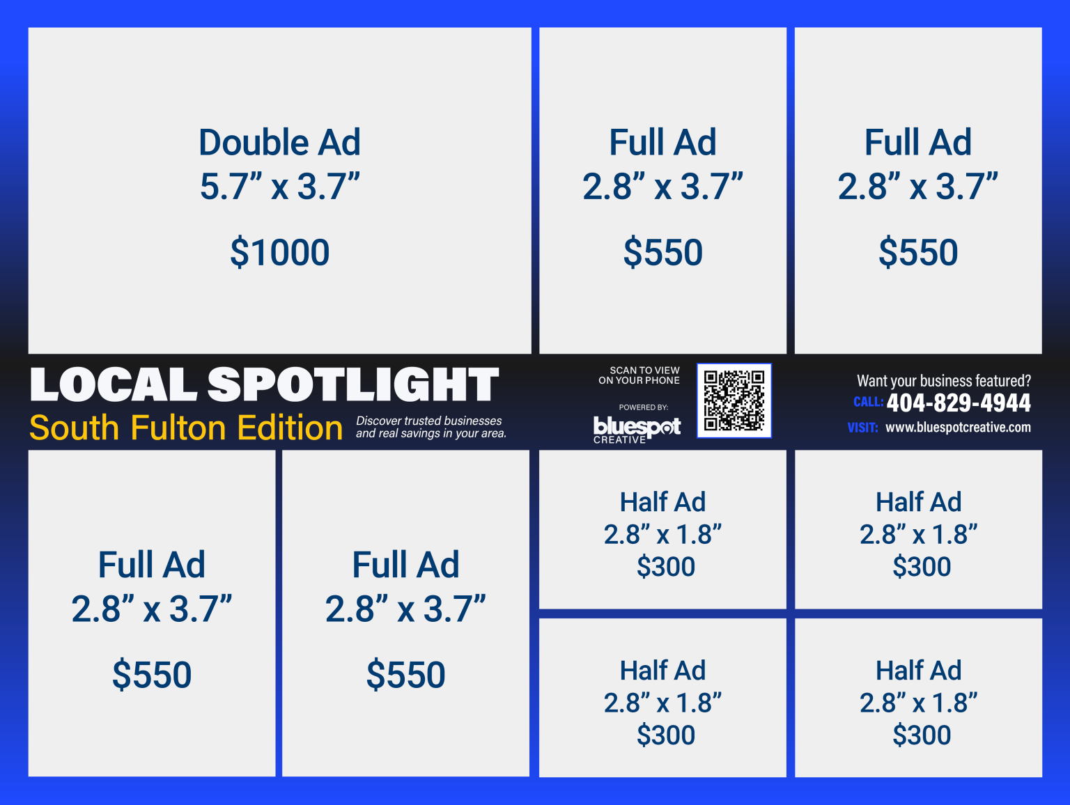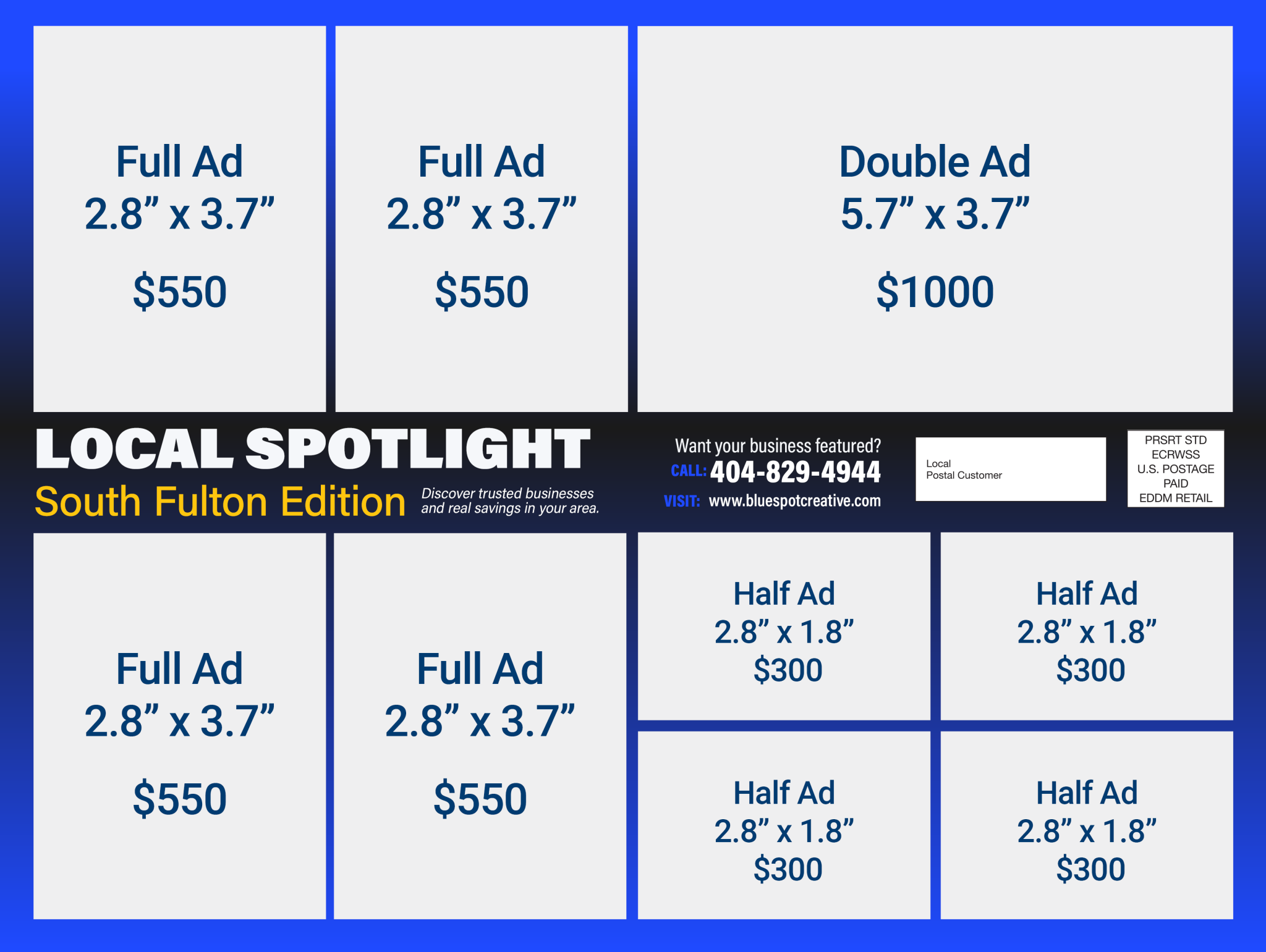 Forget expensive, complicated advertising. Join The Local Spotlight offers a simple, powerful way to reach customers in your own backyard. We deliver our professionally designed 6.5" x 12" Community Card to 2,500 homes in targeted Metro Atlanta and North Georgia neighborhoods each month.
